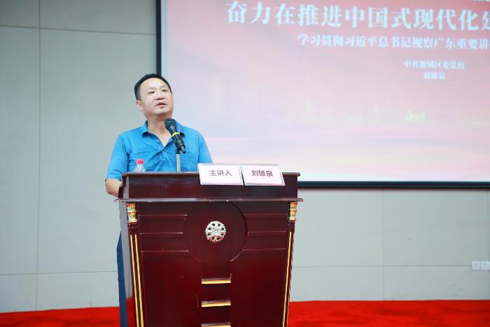 隨后由源城區(qū)黨校教研室主任、四級(jí)主任科員、源城區(qū)委宣講團(tuán)成員劉雄泉老師為全體黨員講授黨課——《奮力在推進(jìn)中國(guó)式現(xiàn)代化建設(shè)中走在前列——學(xué)習(xí)習(xí)近平總書記視察廣東重要講話重要指示精神》。劉老師結(jié)合實(shí)際,就深刻認(rèn)識(shí)習(xí)近平總書記視察廣東的重大意義、實(shí)質(zhì)和豐富內(nèi)涵等方面作了深入的解讀,為黨員們?nèi)嫔钊雽W(xué)習(xí)指明了方向。通過(guò)背景意義、精神實(shí)質(zhì)、推動(dòng)落實(shí)等三大方面,以及大量的數(shù)據(jù)和例子,全面分析了廣東省當(dāng)前的發(fā)展形勢(shì)、面臨的機(jī)遇挑戰(zhàn)和今后的發(fā)展方向,各黨員以學(xué)黨課為契機(jī),提高黨性修養(yǎng),強(qiáng)化擔(dān)當(dāng)作為,增強(qiáng)黨員們對(duì)習(xí)近平新時(shí)代中國(guó)特色社會(huì)主義思想的認(rèn)識(shí)。