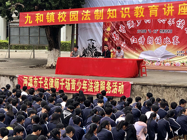 為進(jìn)一步深化青少年權(quán)益保護工作,發(fā)揮律師專業(yè)能力在青少年法制教育當(dāng)中的優(yōu)勢,河源市“千名律師千場青少年法律服務(wù)”活動公益服務(wù)團律師成員——廣東至友律師事務(wù)所朱榮貴律師,于2018年5月10日上午,在紫金縣九和鎮(zhèn)九和中學(xué)舉辦了以“預(yù)防青少年犯罪”為主題的法制教育講座。紫金縣九和鎮(zhèn)九和中學(xué)全校師生將近600人次參加了此次講座。