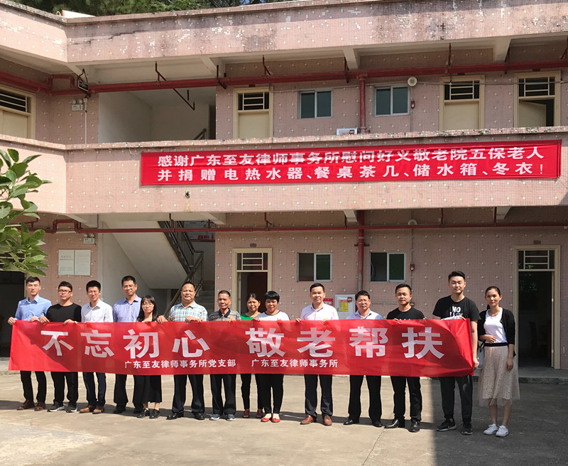 2018年10月27日,在律所黨支部的組織帶領(lǐng)下,廣東至友律師事務(wù)所律師一行來(lái)到河源市紫金縣好義鎮(zhèn)敬老院開展了幫扶慰問(wèn)活動(dòng)。至友律師事務(wù)所此行向好義鎮(zhèn)敬老院捐贈(zèng)了電熱水器、餐桌茶幾、儲(chǔ)水箱等生活設(shè)施用品,切實(shí)改善了老人們的居住條件,為老人們的日常生活提供了便利。隨著冬季到來(lái)氣溫下降,至友所還為敬老院全部老人送去了保暖御寒的冬衣,并將慰問(wèn)金及牛奶等營(yíng)養(yǎng)食品發(fā)放到每一位老人手中,讓老人們深深感受地到來(lái)自社會(huì)的關(guān)愛(ài)和溫暖。此次敬老幫扶活動(dòng)由至友所黨支部倡議和組織,所里全體律師對(duì)此積極響應(yīng),紛紛自愿捐資參與其中。在接下來(lái)3年,至友所將繼續(xù)為好義鎮(zhèn)敬老院完善老人生活設(shè)施設(shè)備、改善居住條件提供必要的幫助和支持。活動(dòng)結(jié)束后,至友所律師們表示開展這樣的敬老幫扶活動(dòng)十分有意義,不僅實(shí)實(shí)在在地幫助到有需要的人,而且在獻(xiàn)出一份愛(ài)心的同時(shí)自己也收獲了快樂(lè)。